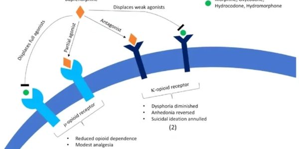 Buprenorphine is a semi-synthetic opioid with mixed receptor activity. Its primary action is partial agonism at the μ-opioid receptor, providing sufficient receptor activation to reduce pain transmission and prevent withdrawal while limiting maximal opioid effects due to its ceiling activity. Buprenorphine also functions as a potent antagonist at the κ-opioid receptor, which reduces dysphoria, stress signaling, and hyperalgesia associated with κ-receptor activation. In addition, it has very high affinity and slow dissociation from the μ-opioid receptor, resulting in sustained receptor occupancy. The net effect is reduced neuronal excitability, diminished perception of pain, and effective suppression of physical withdrawal symptoms.